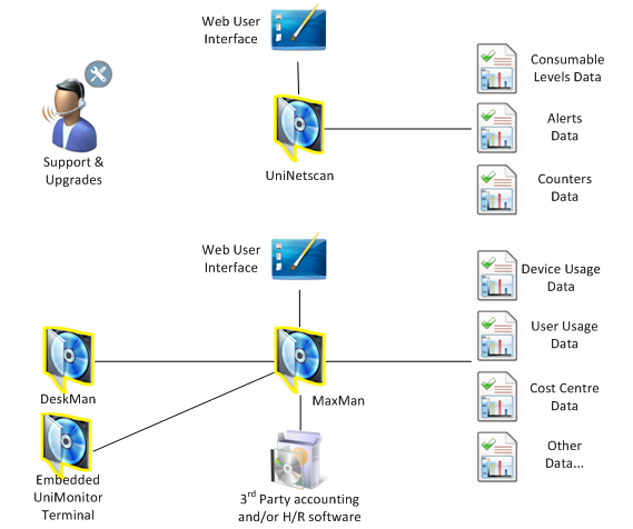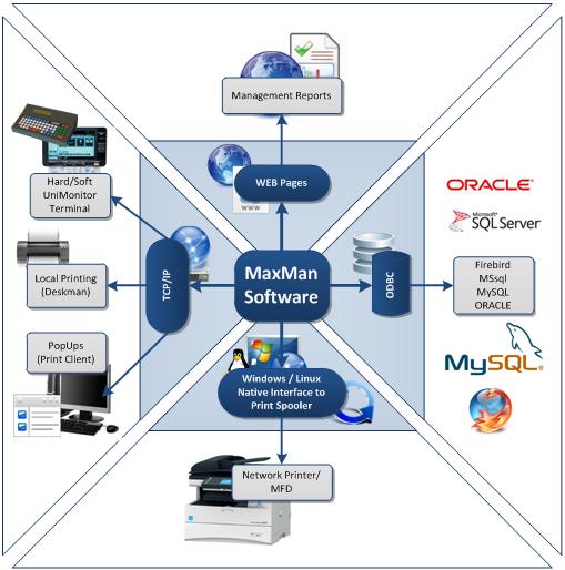The UniTrac System architecture can be divided into four operational quadrants for which the MaxMan software module is the central management hub. These four quadrants are: