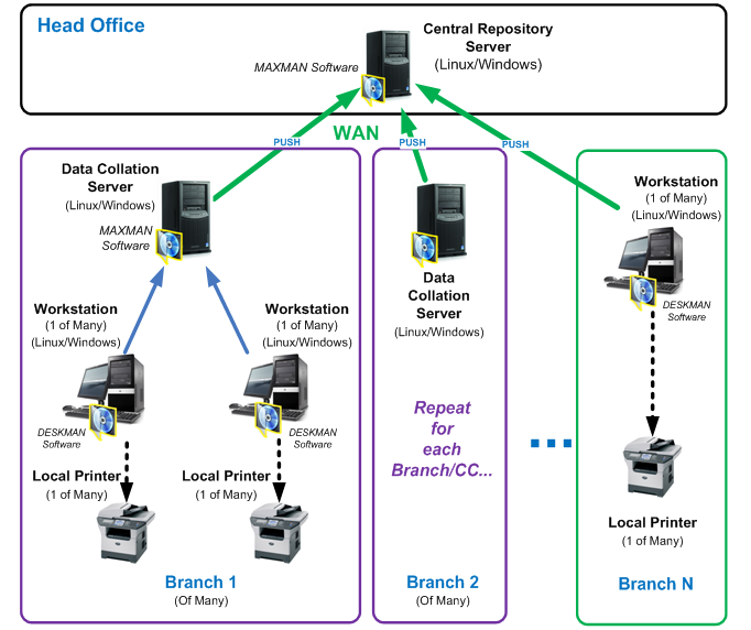 One possible solution for multiple branches with many local printers (USB, LPT) is to have our DeskMan software agent deployed to each branch and report the print management data either directly or via a data collation server (via the MaxMan software module) to head office.